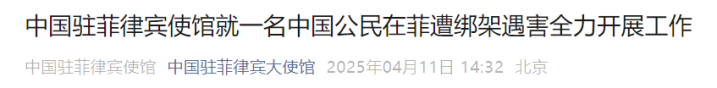 据中国驻菲律宾大使馆微信号4月11日消息,日前一名中国公民在菲律宾遭绑架。中国驻菲使馆高度重视,黄溪连大使第一时间作出部署,相关部门全力开展营救工作,指导并协助家属向菲警方和国内公安部门同步报案,同时要求菲执法部门全力侦办,安全解救人质。不幸的是,该中国公民同其菲籍司机最终被害。使馆向两名遇害者表示沉痛哀悼,向家属表达诚挚慰问,并对凶手予以严厉谴责。